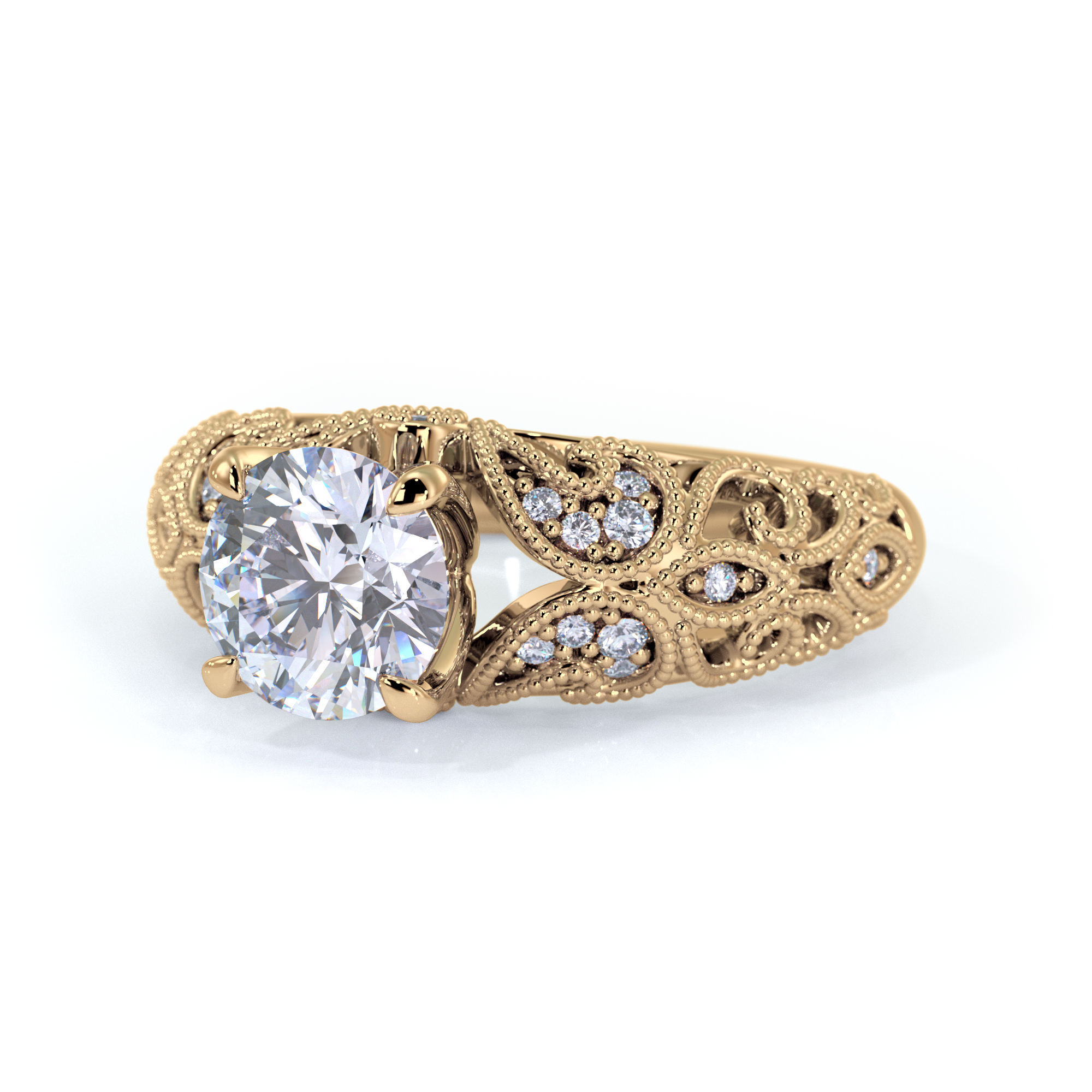 A stunning design with such a deeply classic feeling, truly defining vintage. It showcases elegance and brings harmony with the intricate style and glorious movement on the band bringing the eye to the center stone. Truly it lives up to its name, Judith, the praised one. Evoking the memory of a more regal time, it whispers luxury and captures the heart and eye the way lace on white a shoulder does, exposing just enough to make you wish for more. She who wears this is strength and beauty befitting praise.